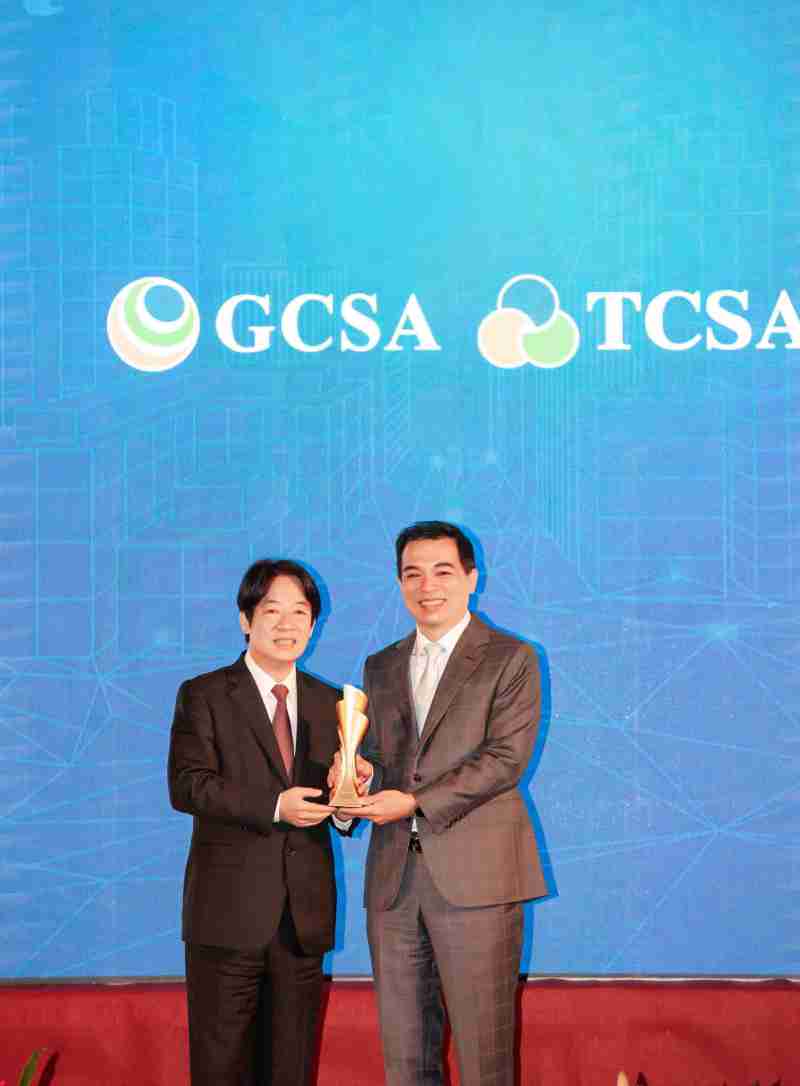 达全方位永续表现获全球永续奖及台湾永续奖肯定,,,由副总统赖清德颁奖 (左),,,尊龙集团总经理柯富仁 (右) 代表领奖