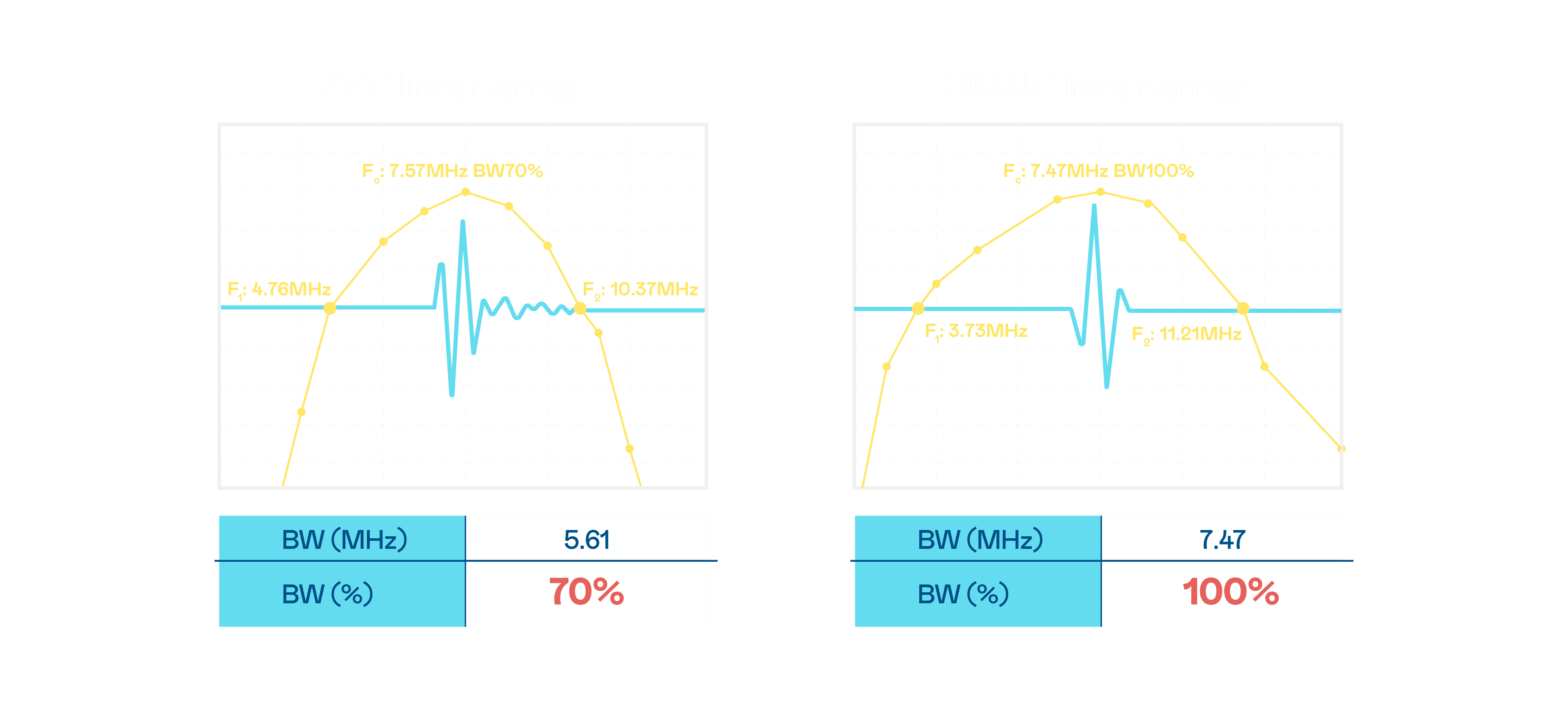 超音波影像的解析度高低,,,首先取决于探头能发出的讯号频宽。。尊龙集团 CMUT 可提供高清晰的超音波讯号,,提供高频宽、、、高灵敏度、、、、影像纹理细节更高的超音波影像,,,协助医护人员缩短影像判读时间及利用精准的医疗影像进行诊断。。。。